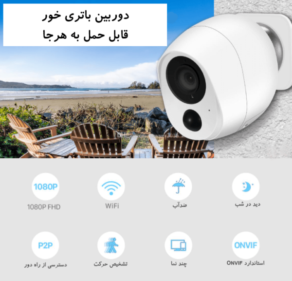 دوربین مداربسته باتری خور یا دوربین مداربسته باغ ویلا کاملا بیسیم میباشد که برای تامین انرژی خود از باتری های قابل شارژ استفاده میکند و تا حدود 12 روز میتواند با همان باتری ها کار کند .این دوربین امنیتی از طریق Wi-Fi به موبایل یا تبلت شما متصل میشودو شما میتوانید به وسیله موبایل یا تبلت خود محل زندگی خود را تحت نظر بگیرید ؛ این دوربین نیازی به نصاب ندارد و خودتان میتوانید آن رادر هرجایی که میخواهید به راحتی نصب کنید اما اگر شما شارژی نمیخواهید می توانید از مدل های دوربین مداربسته خورشیدی ما استفاده کنید که دیگر نیازی به شارژ کردن نیست.